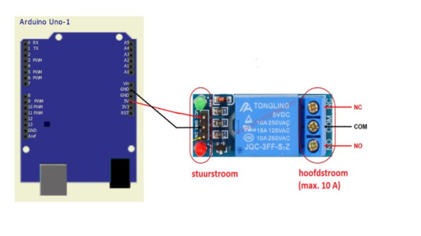 wat ik hier naast doe is de relais bedienen via een code die ik op de Arduino UNO heb gezet.